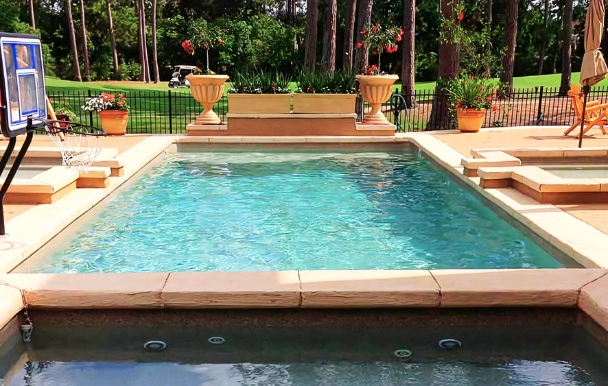 The Barcelona is the perfect rectangle shape with defining clear edges and purposeful curved stairs designed for fun and relaxation.