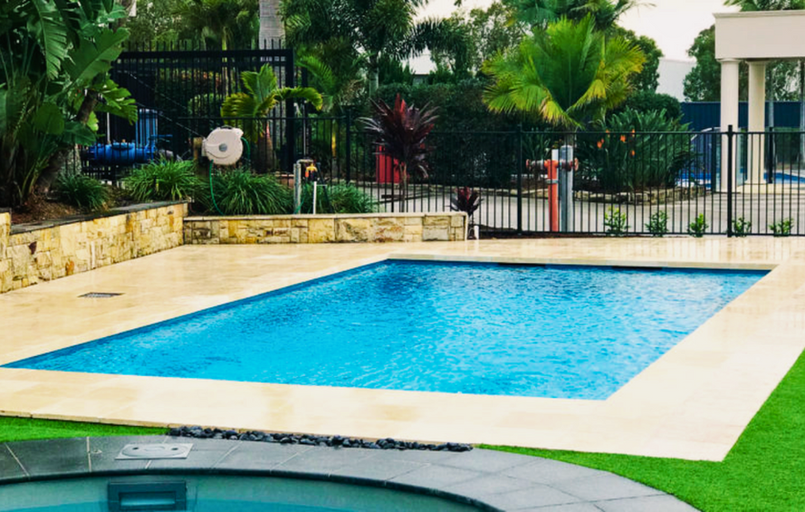 One of our European style inground fiberglass swimming pools, this features a distinctive and eye-catching high-water line. It allows the water in your pool to be almost to the very top of your pool creating a visually stunning swimming pool design. Style and function in one pool.